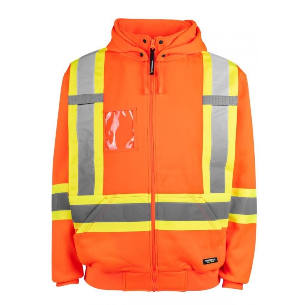 Stay safe and be seen on the job with the Terra Hi-Vis Polyester Fleece Work Hoodie 116506. This hoodie is designed with safety in mind, with high visibility from 2in reflective tape over a 4in contrast stripe across the chest, shoulders and back. It's made of durable anti-pill knitted fleece for long-lasting wear and comfort and comes with a detachable hood with two levels of snaps to accommodate a hard hat.