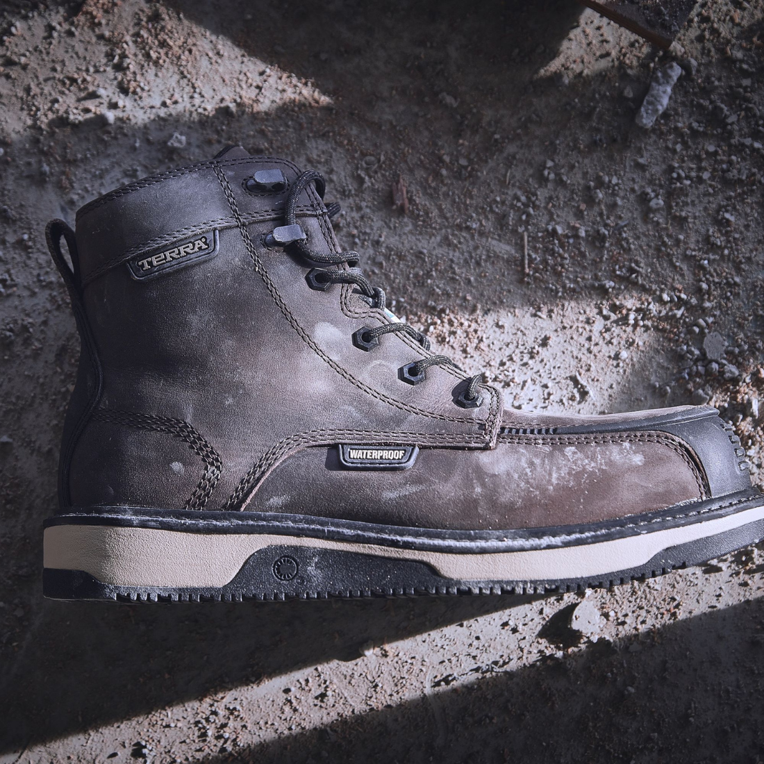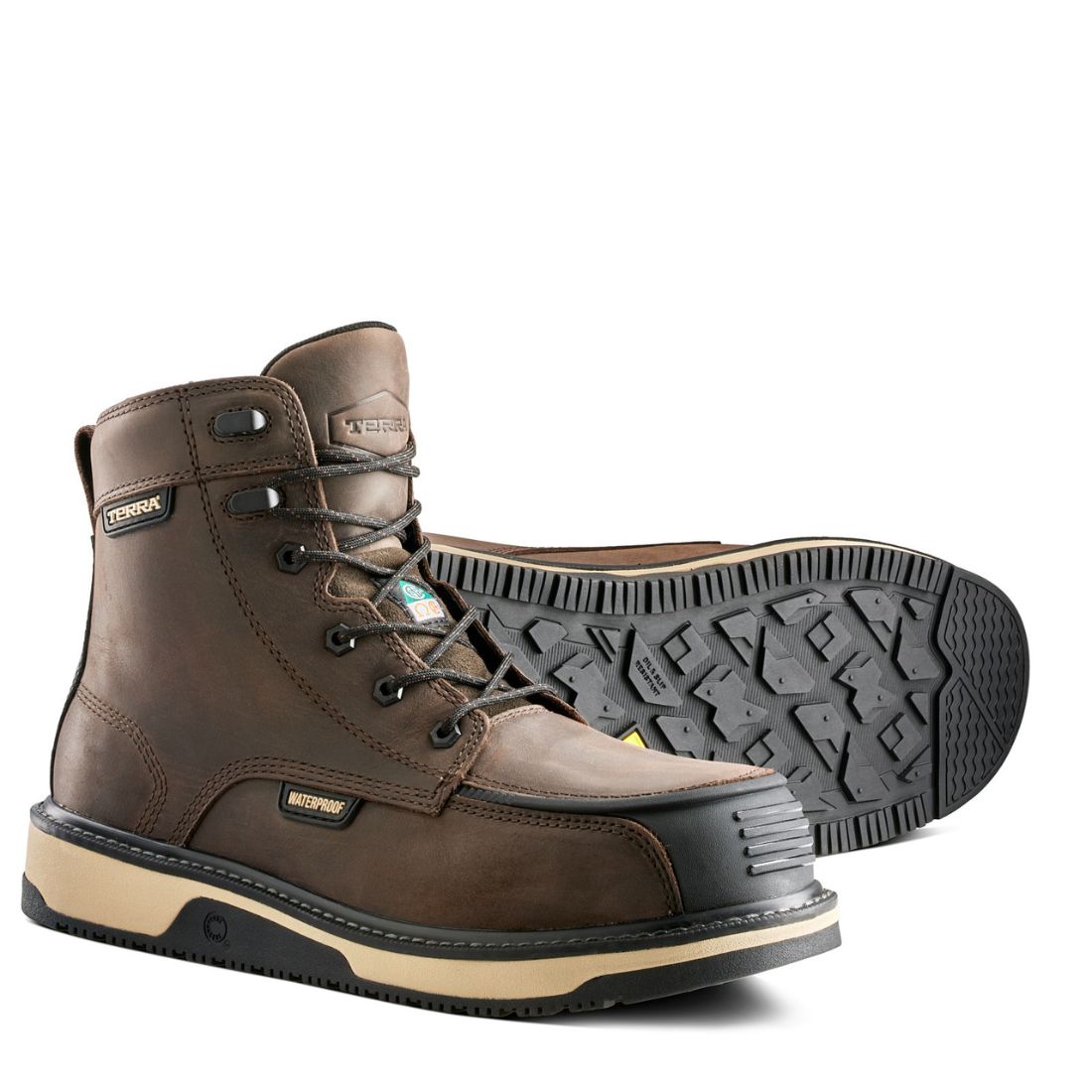 Stay protected and comfortable on the job with the Terra Ironstone Men's 6" Waterproof Composite Toe Work Boot. Made with full-grain, barnyard resistant leather and a waterproof Hydroguard® membrane, these boots keep your feet dry and comfortable. Featuring a TERRA DURA-MOC™ TPU toe bumper and durable rubber outsole, these boots provide increased abrasion protection and high-traction grip. Plus, the CLEANFEET® odour-control treatment and shock absorbing midsole make for a truly comfortable and odor-free work experience. With CSA Grade 1 composite toe and plate, as well as E.S.R. and OMNICORE™ construction, these boots are 100% metal free for added safety.
