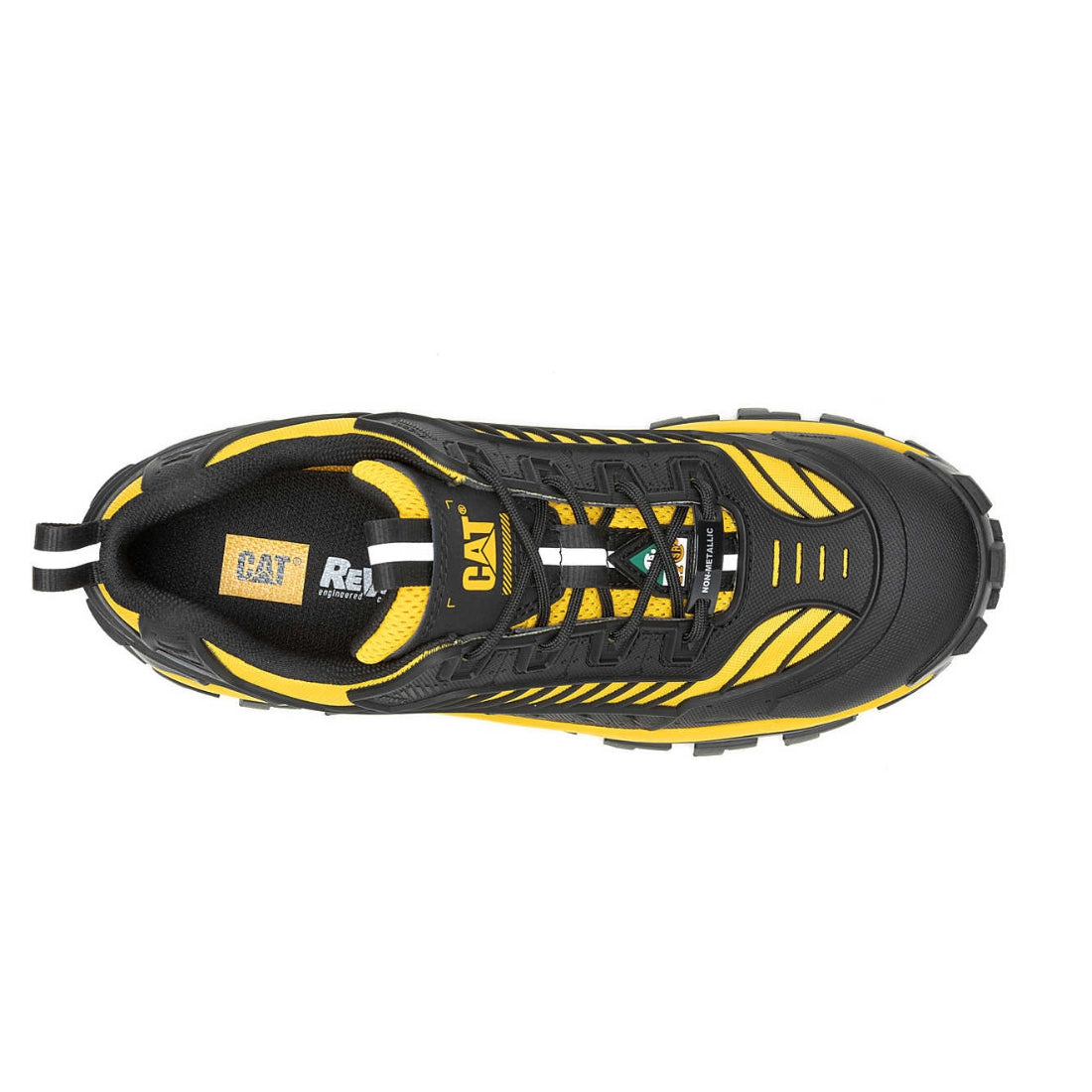 Experience the unmatched durability and protection of the CAT Invader Mecha men's athletic shoe. With an industrial-grade rubber outsole and aggressive lug pattern inspired by Cat® machines, you'll have unbeatable traction on any surface. The composite toe and slip-resistant outsole offer non-metallic protection and grip on low traction surfaces, while the Electrical Hazard Protection keeps you safe. Made with 100% post-industrial recycled lining and resilient EVA foam midsole, this shoe is also environmentally friendly. Upgrade your work footwear game with the CAT Invader Mecha shoe.