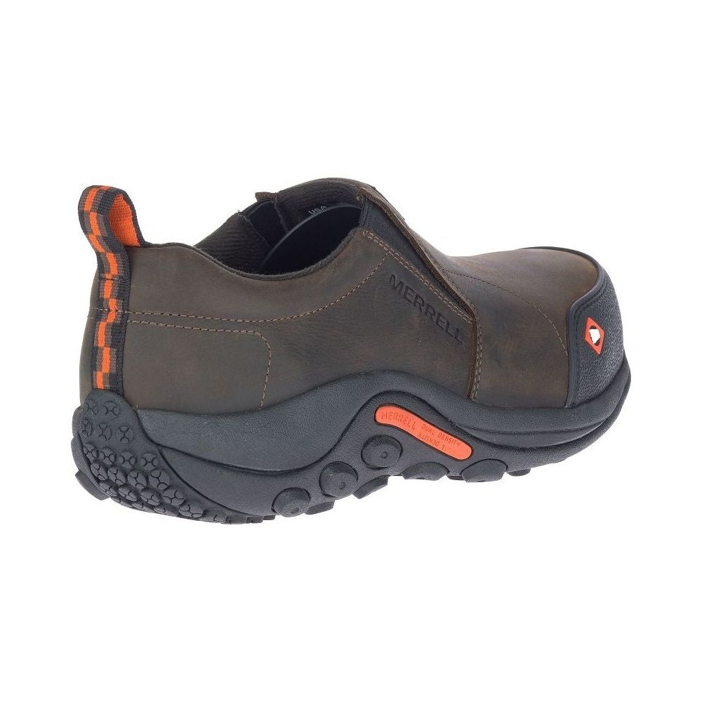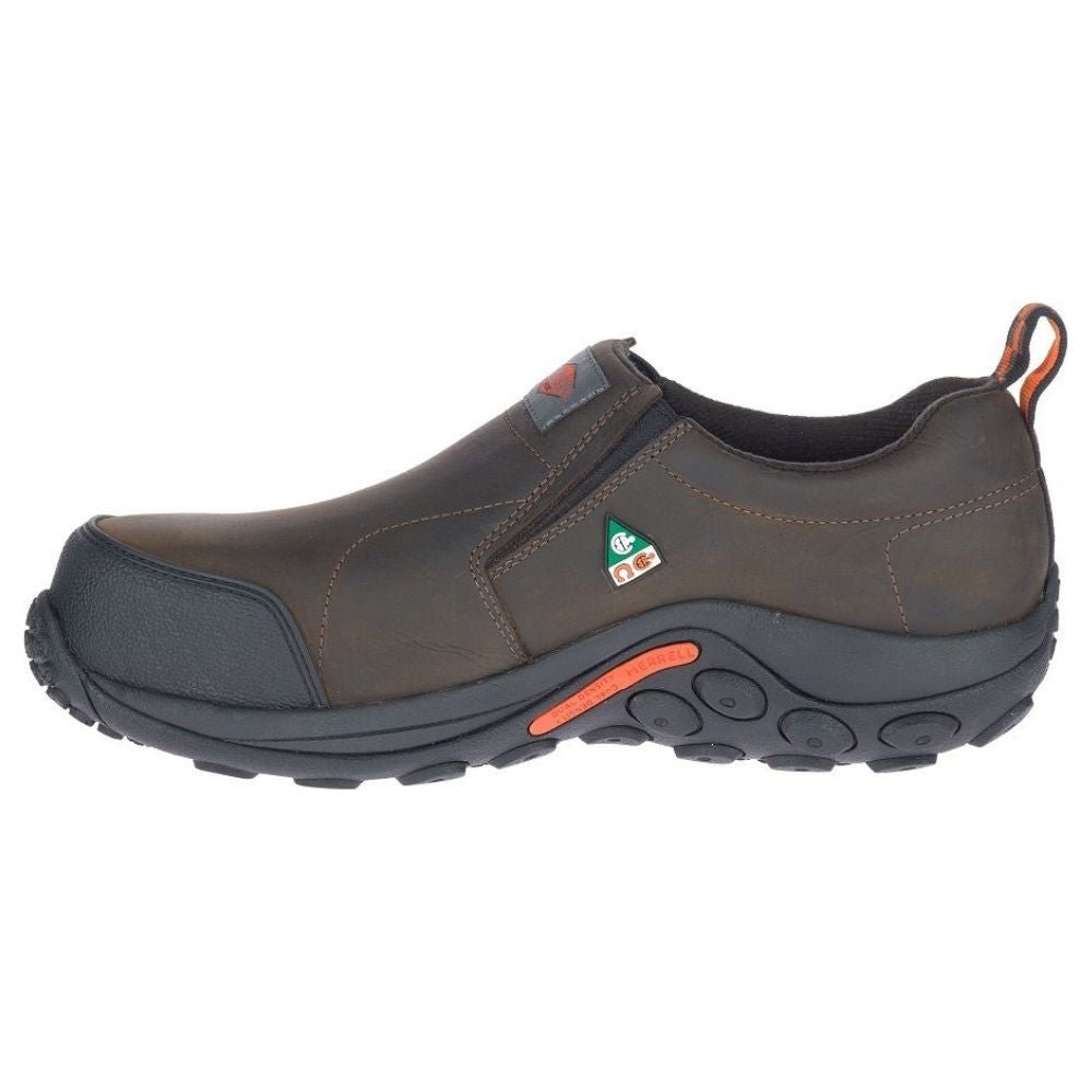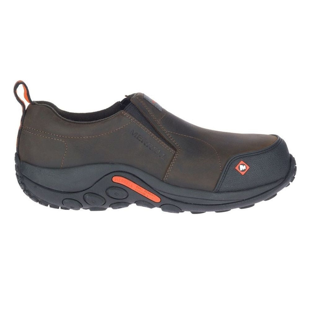 The Merrell Jungle Moc Men’s Composite Toe Slip-On Work Shoes deliver the rugged durability and all-day comfort you need on the job. Built with a waterproof full-grain leather upper and double stretch gore panels for easy on and off, these slip-ons are ready to handle tough conditions. A protective rubber toe cap and composite safety toe provide CSA-rated protection, while the breathable mesh lining and Cleansport NXT™ treatment keep feet fresh.