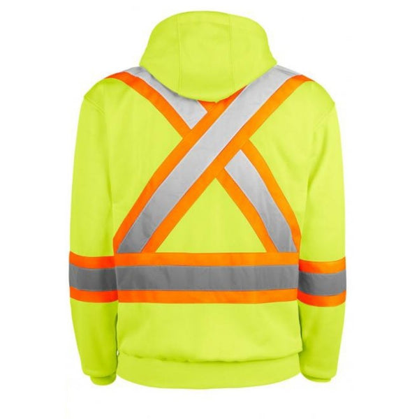 Stay safe and be seen on the job with the Terra Hi-Vis Polyester Fleece Work Hoodie 116506. This hoodie is designed with safety in mind, with high visibility from 2in reflective tape over a 4in contrast stripe across the chest, shoulders and back. It's made of durable anti-pill knitted fleece for long-lasting wear and comfort and comes with a detachable hood with two levels of snaps to accommodate a hard hat.