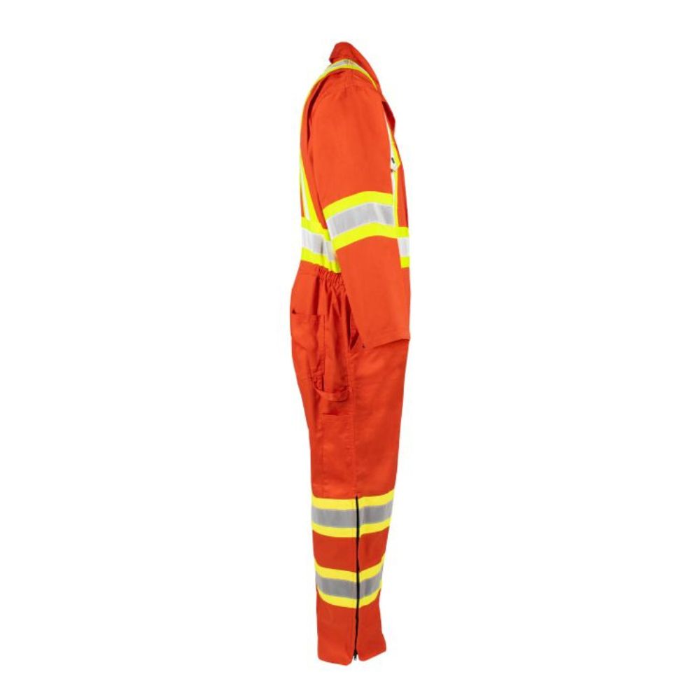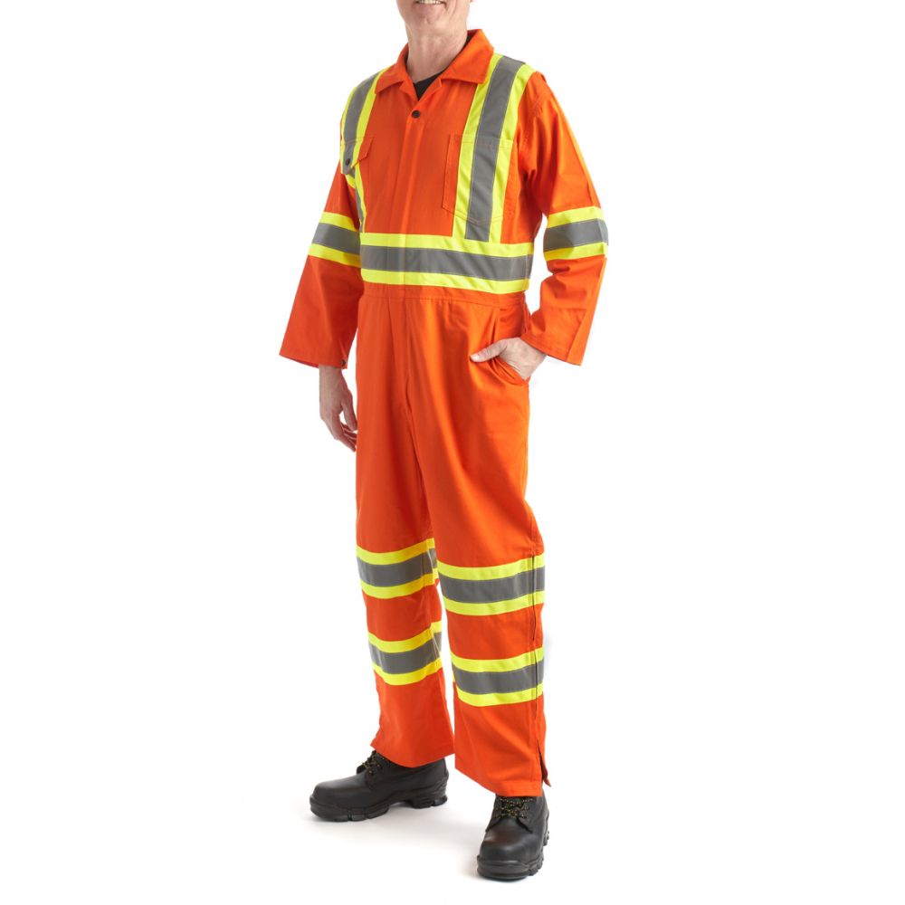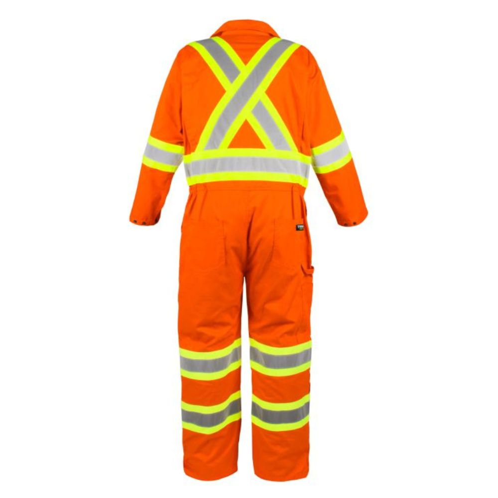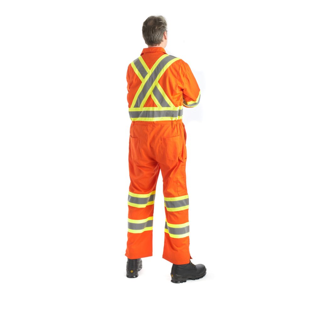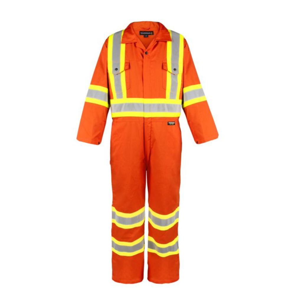Stay safe and visible in Terra's High Visibility Unlined Coverall. Made with durable 5.6 oz polyester and cotton, featuring double stitched 2 in reflective tape and contrast stripes for maximum visibility. Adjustable cuffs and multiple gussets provide comfort and flexibility. Comes equipped with a 2-way nylon zipper, side leg zipper, and multiple pockets for convenience on the job.