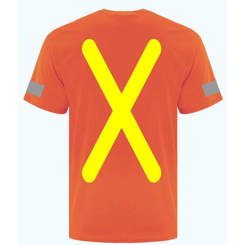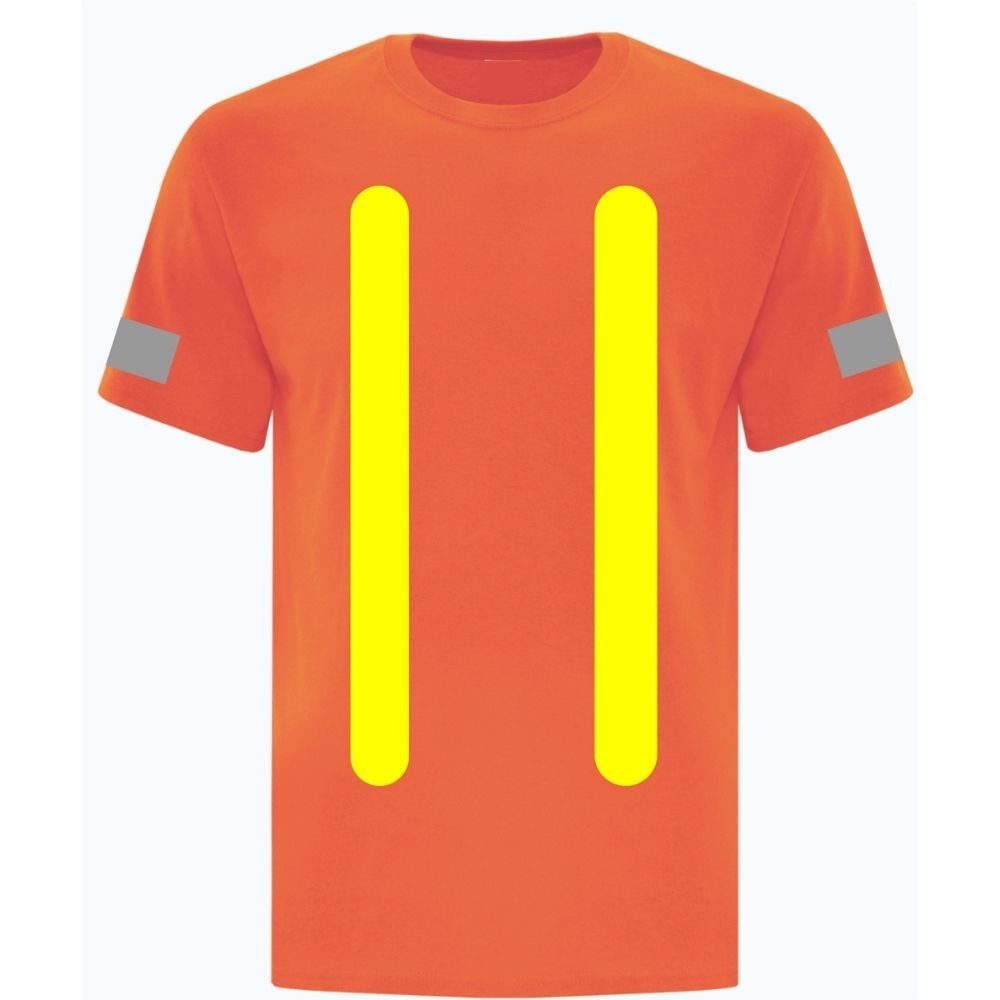 100% cotton high-visibility t-shirt featuring screen-printed visibility stripes. This t-shirt also features reflective sliver safety strips on the sleeves for extra visibility at night.