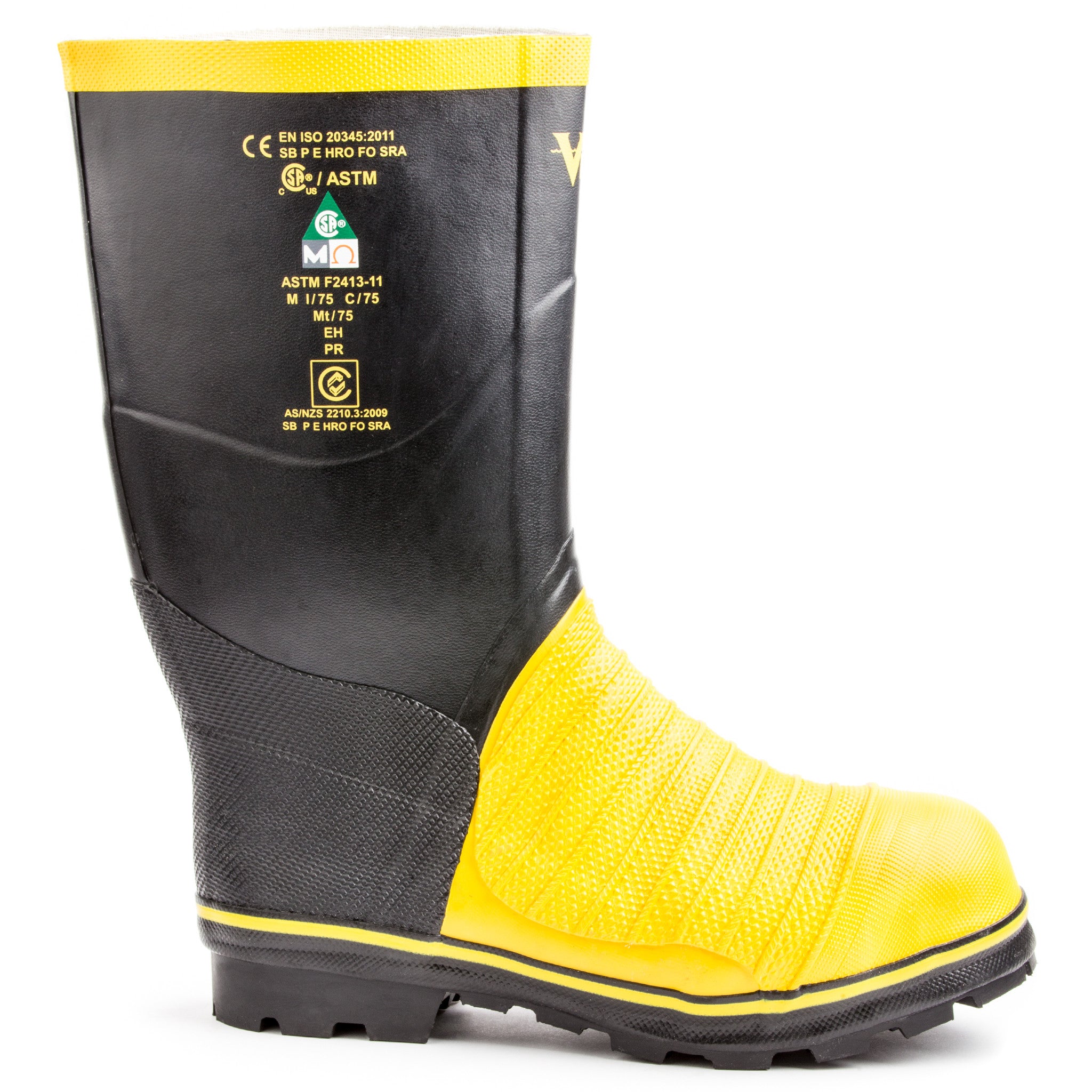 The Viking Miner 49er Metatarsal Steel Toe Rubber Safety Boot is designed for safety and comfort in tough workplaces. With its SBR blended NR upper and cotton canvas lining, this boot is highly chemical resistant, allowing you to work with confidence. Its air-cushioned NBR lug sole is slip-resistant, heat-resistant, X-capable, and exceeds a 305K flex rating, making these boots some of the most flexible and capable on the market. Not only that, but it's also sodium cyanide resistant up to 30% concentration. With Achilles tendon and ankle protection, as well as hang holes on the sides and 14" of tall height for added comfort and protection.