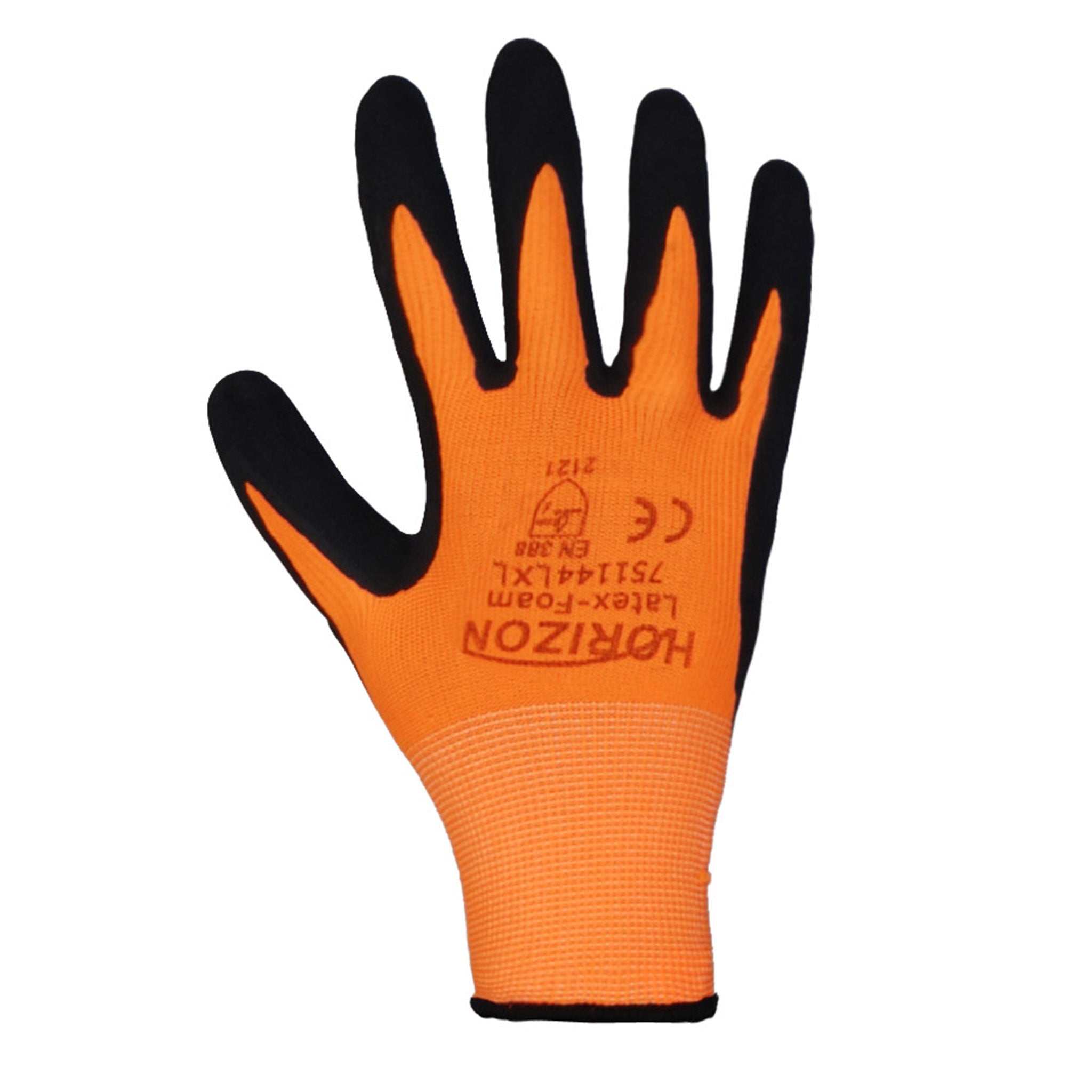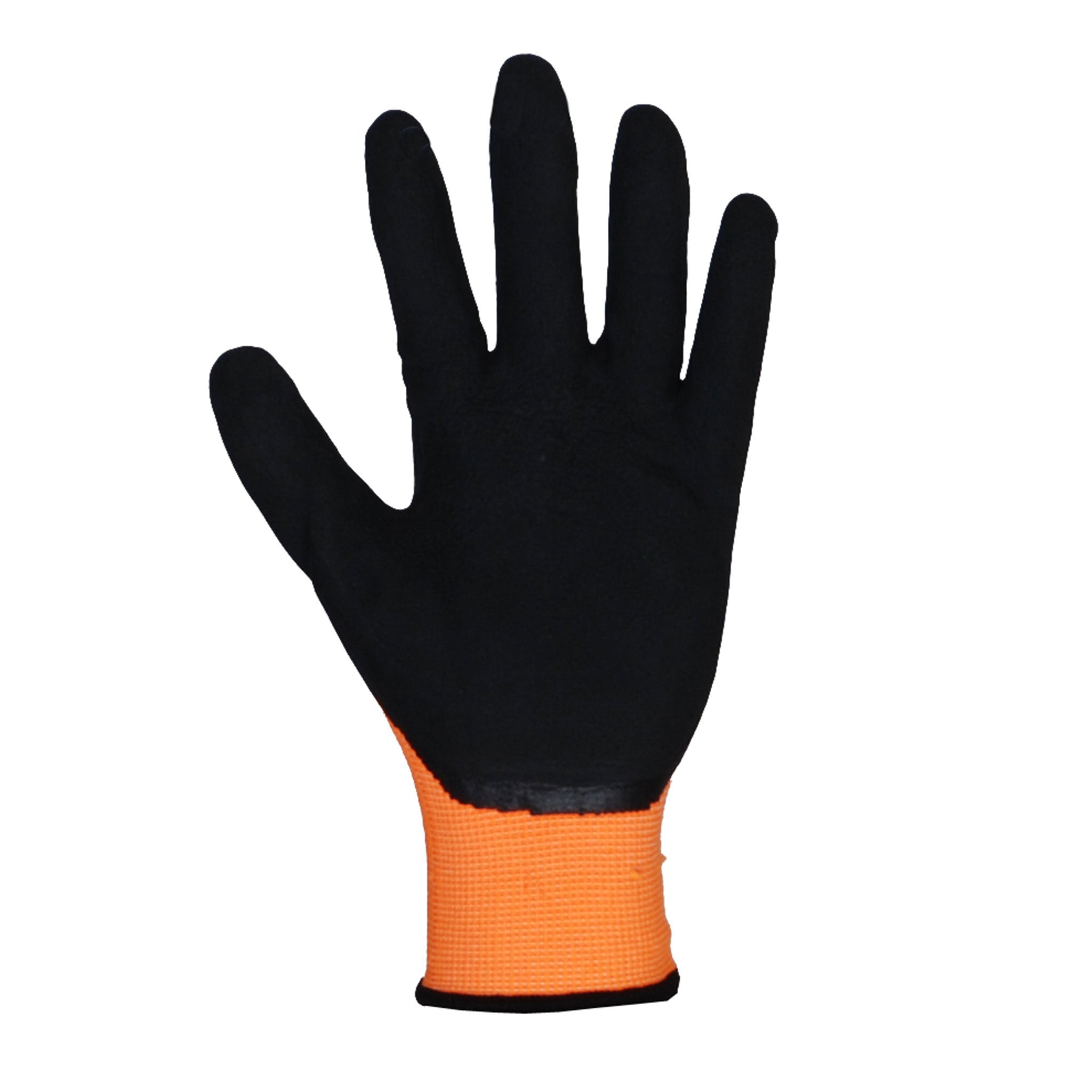Black latex foam coated glove has orange hi viz polyester stretch fabric. 1 pair per package.