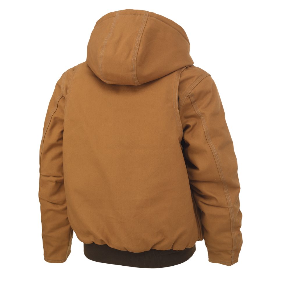 Tough Duck Women's Premium Duck Work Bomber Jacket hits just right to give you the freedom of movement you want. Designed with 100% cotton 12 oz duck, this water-repellent jacket has an attached hood with drawstring and rib-knit storm cuffs.